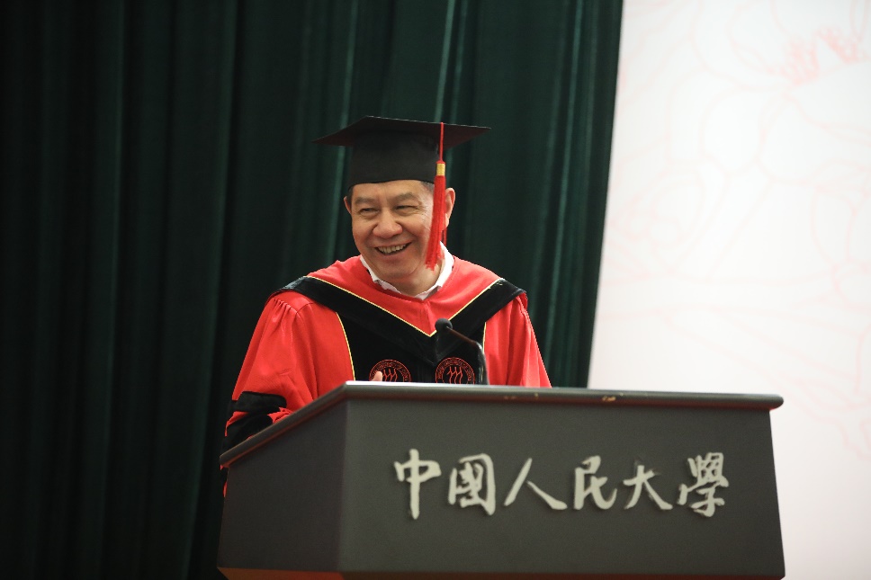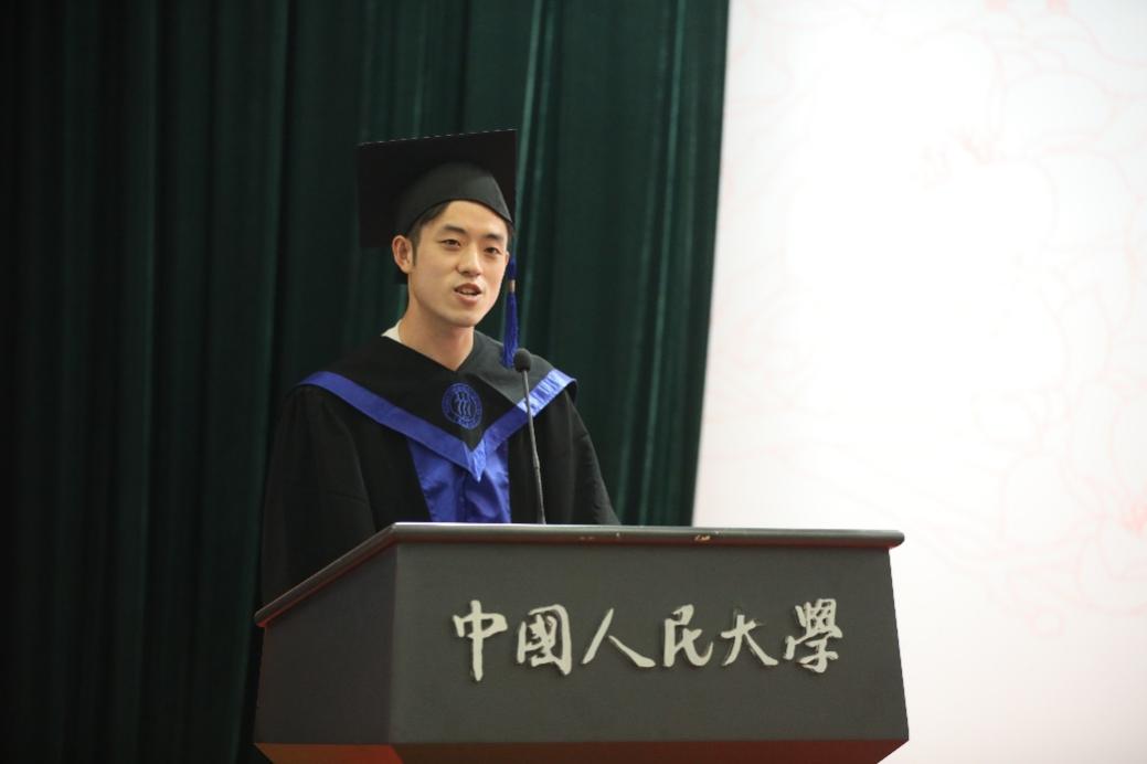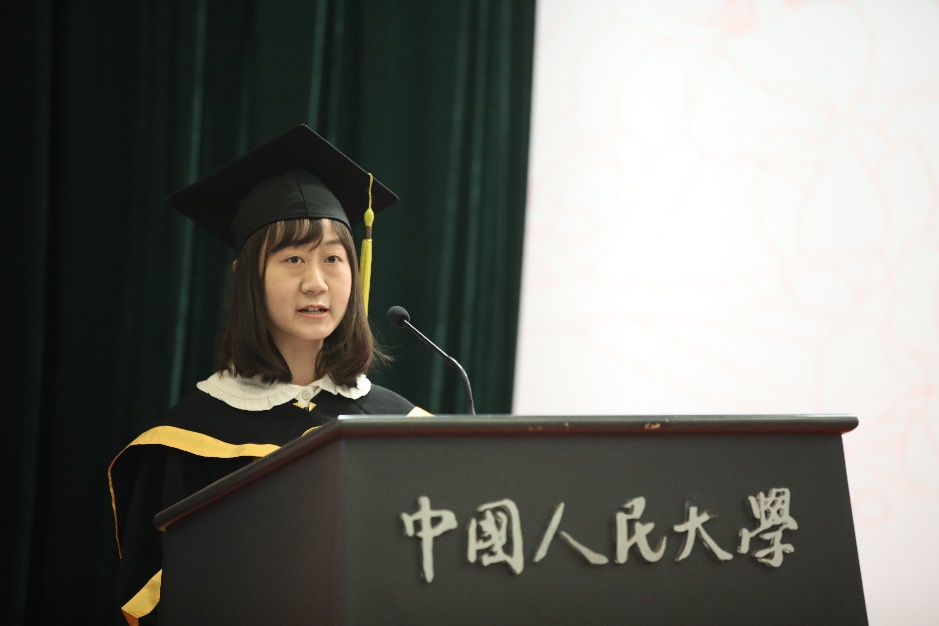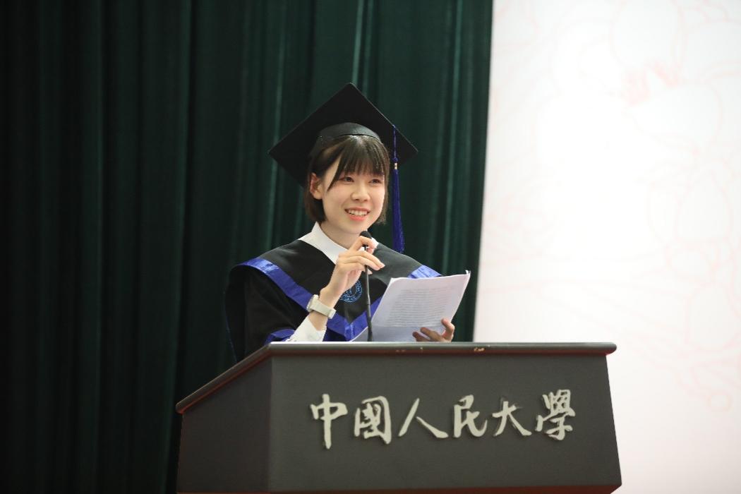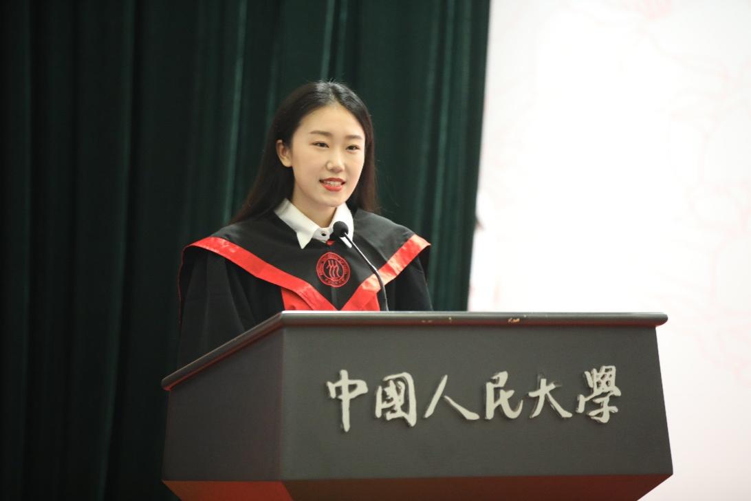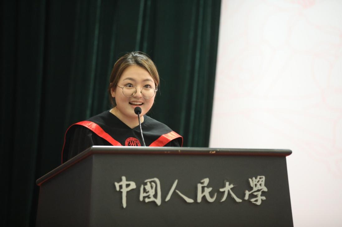 博士生代表、2017级语言学及应用语言学陈天琦以“专属于人大人的精神力量”为主题内容与各位毕业生共勉。这份力量源于生养于此的拳拳神情,是对实事求是的执着坚守、是求知求真路上的踏实探寻;更是无惧于沧海一粟的有限、渺小,亦有海纳百川的无穷魄力。