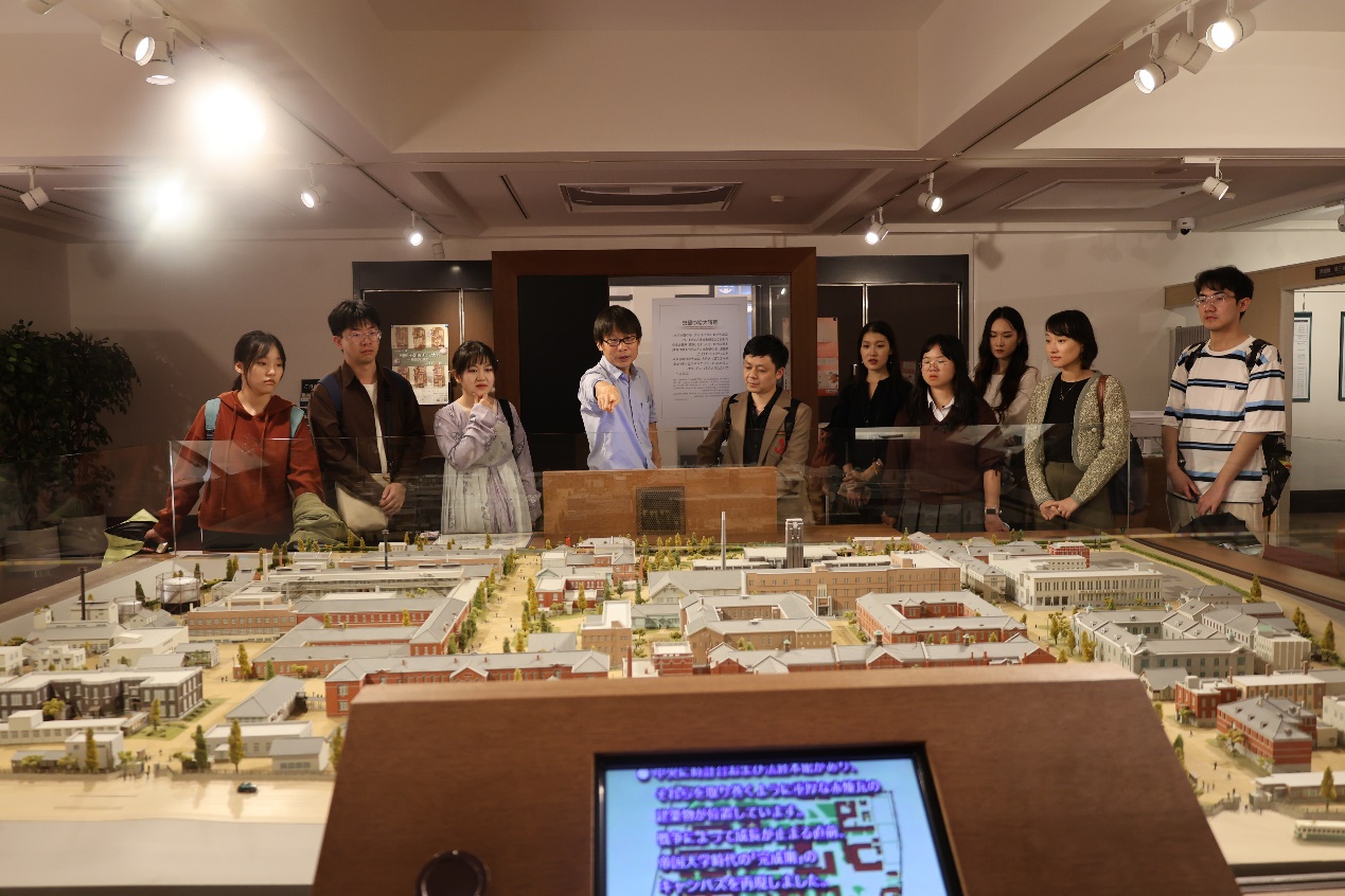 10月23日,Bet365中文比分 师生访问团抵达京都大学继续开展学术交流与合作洽谈。京都大学国际高等教育院韩立友教授带领团员们参观了京都大学校史馆,深入了解这所历史悠久的学府的文化与成就。校史馆展示了京都大学自创校以来的珍贵文物、历史资料以及著名校友的成就,充分体现了该校在科学、技术、人文学科等多个领域的卓越贡献。团员们对京都大学在国际学术界的影响力有了更深刻的理解。
