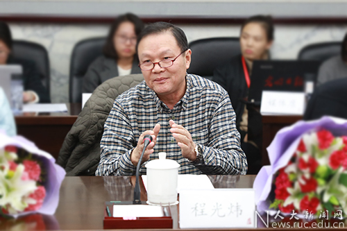 程光炜教授代表杰出人文学者特聘教授发言。他表示,在高等学府基础学科从事教学和科研的教师,需要保持极大的精神信仰和热情,默默无闻的心态和忍耐力,更需要有长期坐冷板凳的认真严谨和科学的治学态度。自己几十年来在本学科领域取得的一点成绩得益于人民大学提供的优质平台,人民大学聘任杰出人文学者不仅是对首批受聘教师的鼓励,也是对人文学科所有教师的巨大鼓舞。相信这一举措将对人文学科未来的发展、对增强人民大学在国内外相关学科领域的优势地位发挥更大作用。