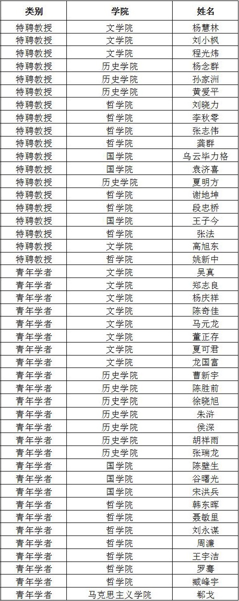 杨慧林教授、刘小枫教授、程光炜教授、高旭东教授入选杰出人文学者特聘教授,吴真、郑志良、杨庆祥、陈奇佳、马元龙、董正存、夏可君、龙国富入选杰出人文学者青年学者。