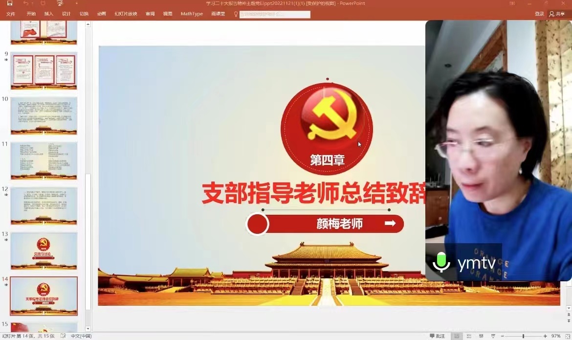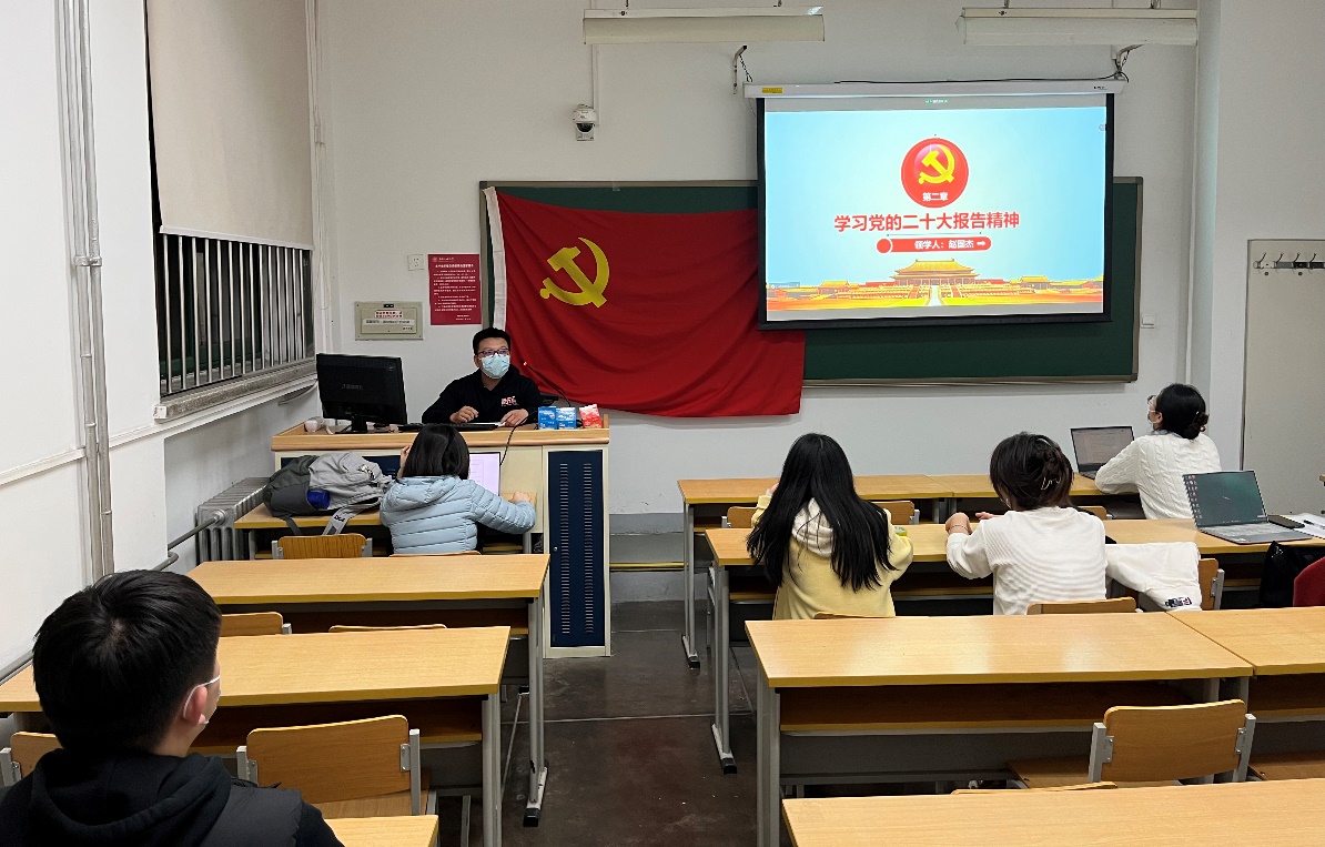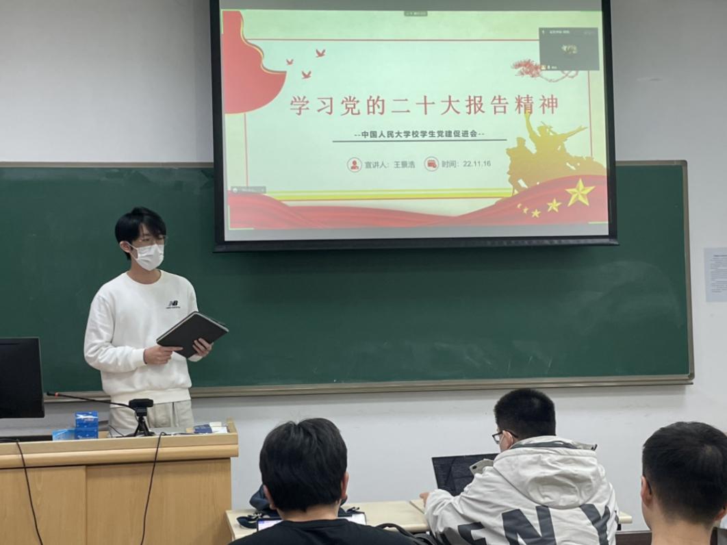“1+1”联系支部对接老师侯佳俐老师从三个方面总结发言。第一,理论学习要有系统性的思维。侯老师建议大家将二十大报告与十九大报告、中国人民大学第十五次党代会报告等参照学习,这样能够更加清楚问题的来龙去脉,理论如何运用于实践,政策又是如何落地的。第二,学习要有问题意识。只有带着问题去学习二十大报告,才能更加深入。第三,专业学习和二十大报告学习双促进、双融合。大家在深耕于自己所学专业的同时,要将二十大报告的学习与自身科研及未来工作相联系,将专业理论学习与社会、国家发展相结合。