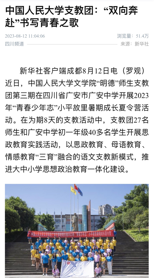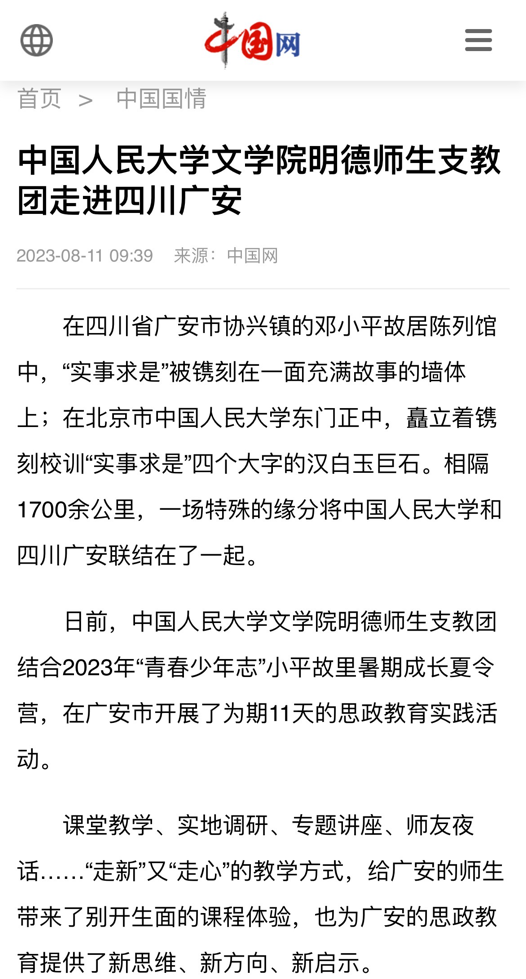以“三育”融合的语文支教新模式助力教育强国建设——Bet365中文比分 师生赴四川广安开设“青春少年志”小平故里暑期成长夏令营