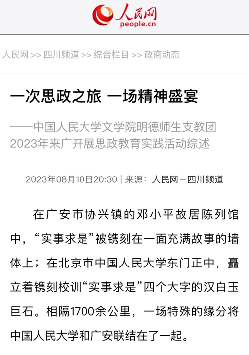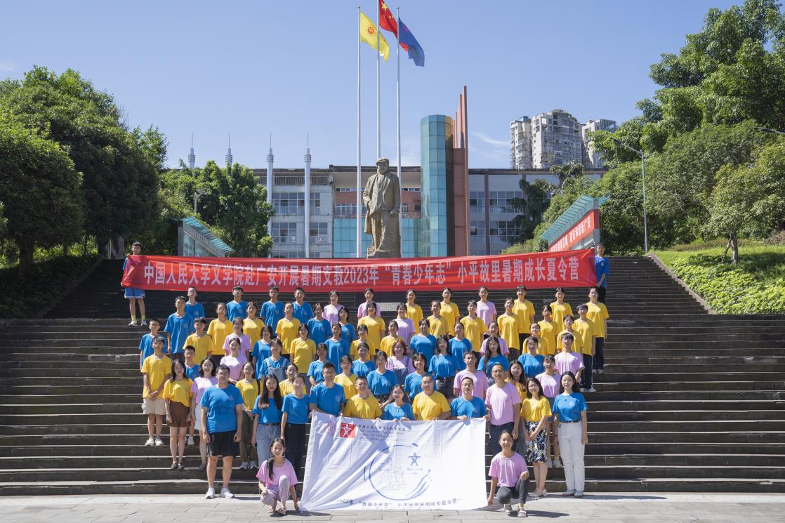 为推进学习贯彻习近平新时代中国特色社会主义思想主题教育走深走实,把习近平新时代中国特色社会主义思想引领下中国式现代化教育的宏伟实践作为最生动的思政课堂,Bet365中文比分 “明德”师生支教团第三期于2023年8月2日至9日在四川省广安市广安中学开展2023年“青春少年志”小平故里暑期成长夏令营。8天时间里,支教团27名师生和广安中学初一年级40余名学生共同开展思政教育实践活动,创新以思政教育、母语教育、情感教育“三育”融合的语文支教新模式,落实习近平总书记在中国人民大学考察调研时的重要讲话精神,为推进大中小学思想政治教育一体化建设和教育强国建设提供人大方案。