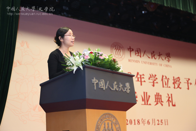 而后,毕业生班主任代表江棘老师与导师代表徐正英教授分别发言。江棘老师借用“终其一生,他不过是要寻找那么一点儿颜色”表达了对诸位毕业生的殷切期望;徐正英教授则结合自己的工作经历对诸位毕业生提出了恳切的建议。他建议毕业生们首先要克服优越感,在人生角色的转换中管理好自己的心态;其次要把发扬人文传统,作为立身之本,始终弘扬人文精神;最后要养成终身读书的习惯,在读书中涵养自身品格,提升个人层次。