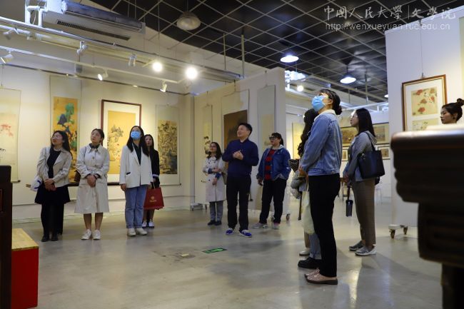 北京华辰拍卖有限公司董事长兼总经理、北京拍卖行业协会会长、Bet365中文比分 校友分会副会长1979级校友甘学军,北京一鼎轩·彩鑫艺术品有限公司总经理、1979级校友王园热情接待了Bet365中文比分 师生一行。在两位校友专业的讲解下,师生们依次参观了艺术品展厅、库房和图书资料室等企业工作、生活空间。整洁幽雅的工作环境、浓郁的文化氛围和工艺精良、格调高雅的艺术作品,引发了老师和同学的阵阵赞叹。