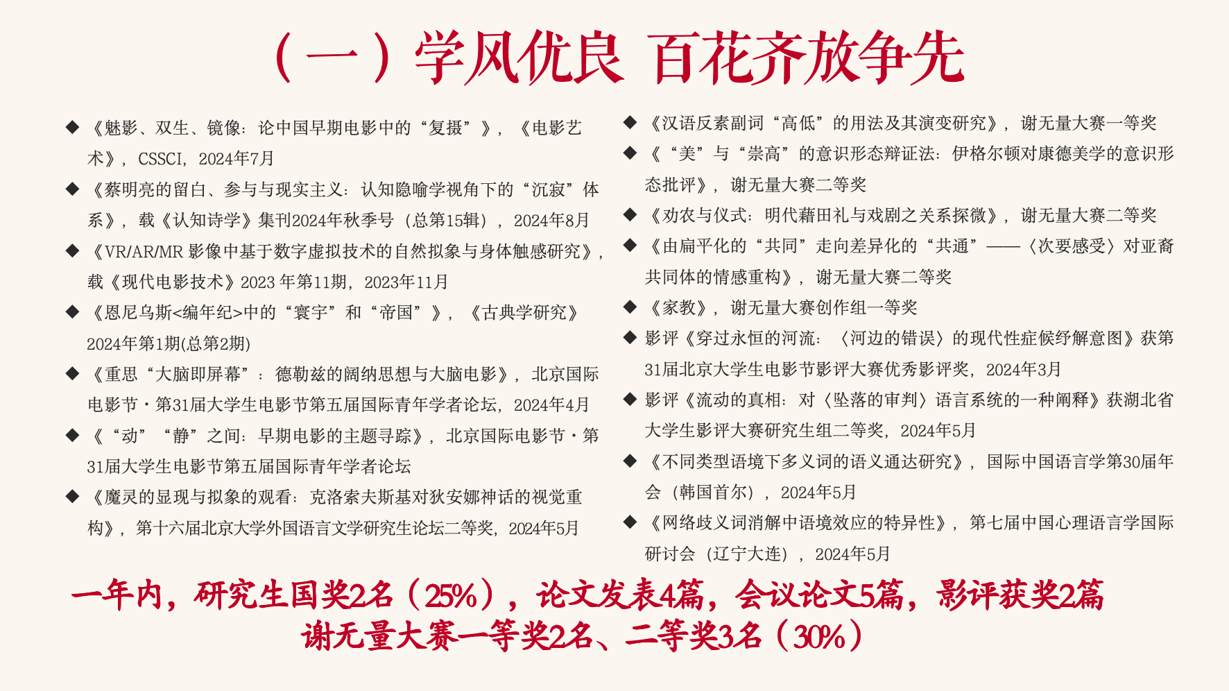 班级同学秉持追求真理的信念,自觉接受严格的学术训练,在各自专业领域取得了优异的成绩。王涵玉、方乐雅2名同学获国家奖学金,占Bet365中文比分 硕士国奖名额的25%。班级同学在《电影艺术》《认知诗学》《古典学研究》等刊物上发表了4篇高质量论文,展现了专业素养与学术深度。我班在Bet365中文比分 谢无量大赛中斩获2个一等奖和3个二等奖,占硕博组获奖人数近30%。此外,班级同学还发声于北京国际电影节·第31届大学生电影节第五届国际青年学者论坛、国际中国语言学第30届年会、中国心理语言学国际研讨会、北京大学外国语言文学研究生论坛等学术论坛。