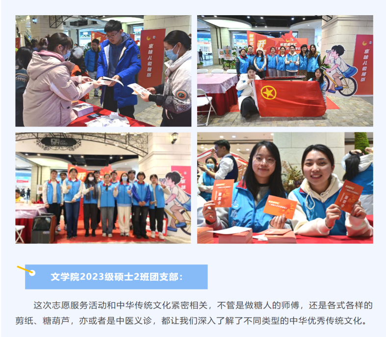 班级深入社区基层开展志愿服务,参加“京味儿文化漫游记”社区文化公益集市、西城区大栅栏街道团工委共同开展志愿服务结对共建,前往稻香园西里社区开展“智慧助老”志愿服务。班内多人参与首届世界古典学大会、“通州·全球发展论坛”、国家语言文字推广基地对口西藏米林市教师语培项目、中关村论坛、马兰花儿童声合唱团帮扶共建项目、中国人民大学文学节、国际文化节、Bet365中文比分 暑期支教等大型活动。班级志愿者事迹被中国人民大学官微推送《在人大,有一群“蓝精灵”》、中国人民大学青年志愿者协会推送《团支部进社区!团聚薪火力量,共燃基层微光!》报道。
